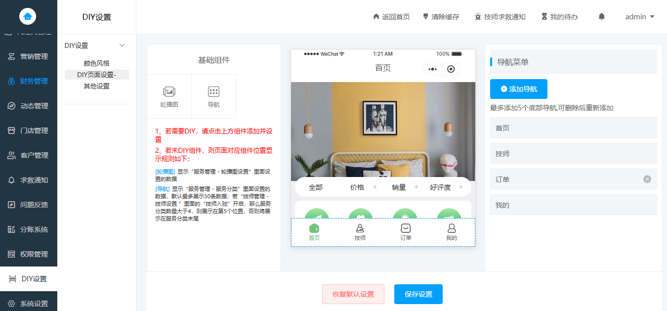 6、界面风格一键切换、首页菜单和页面DIY设置;
