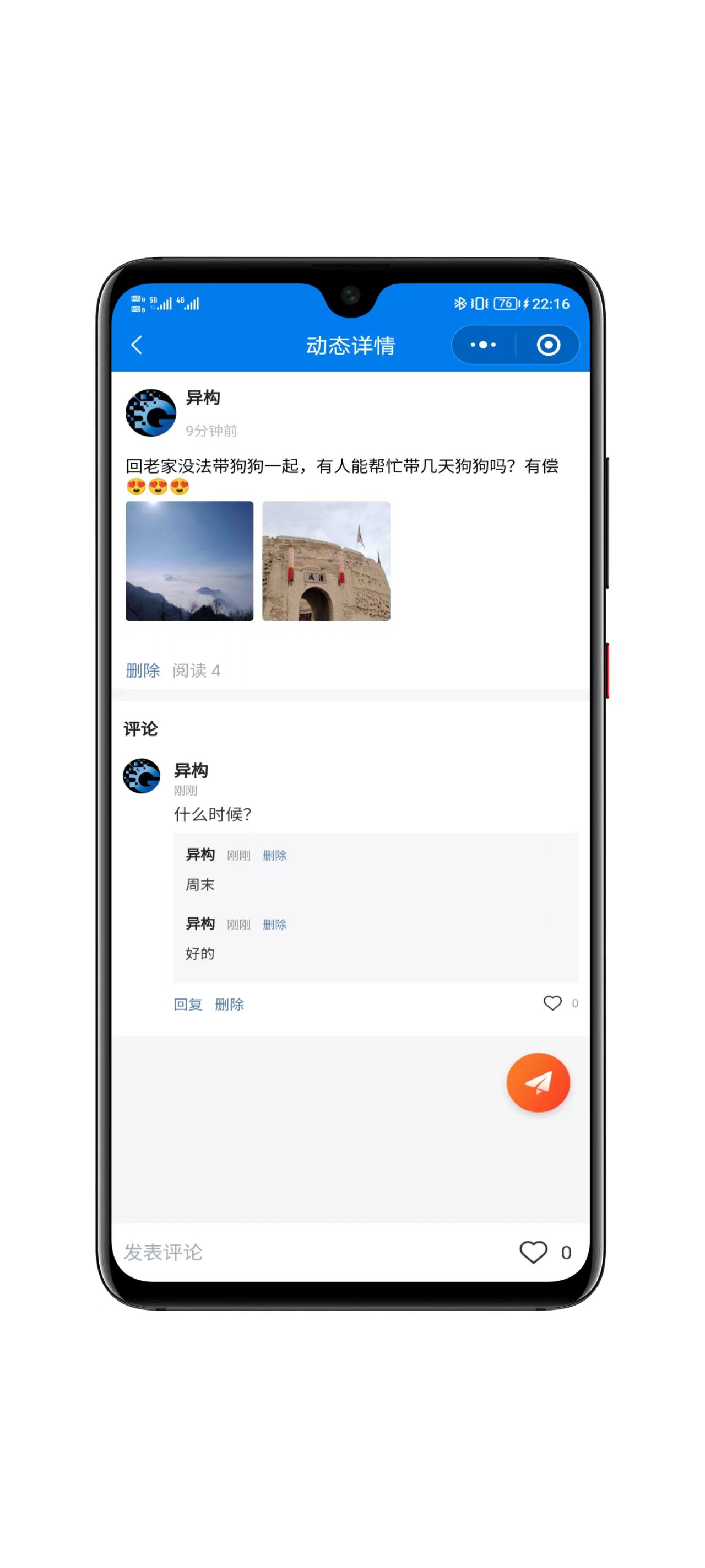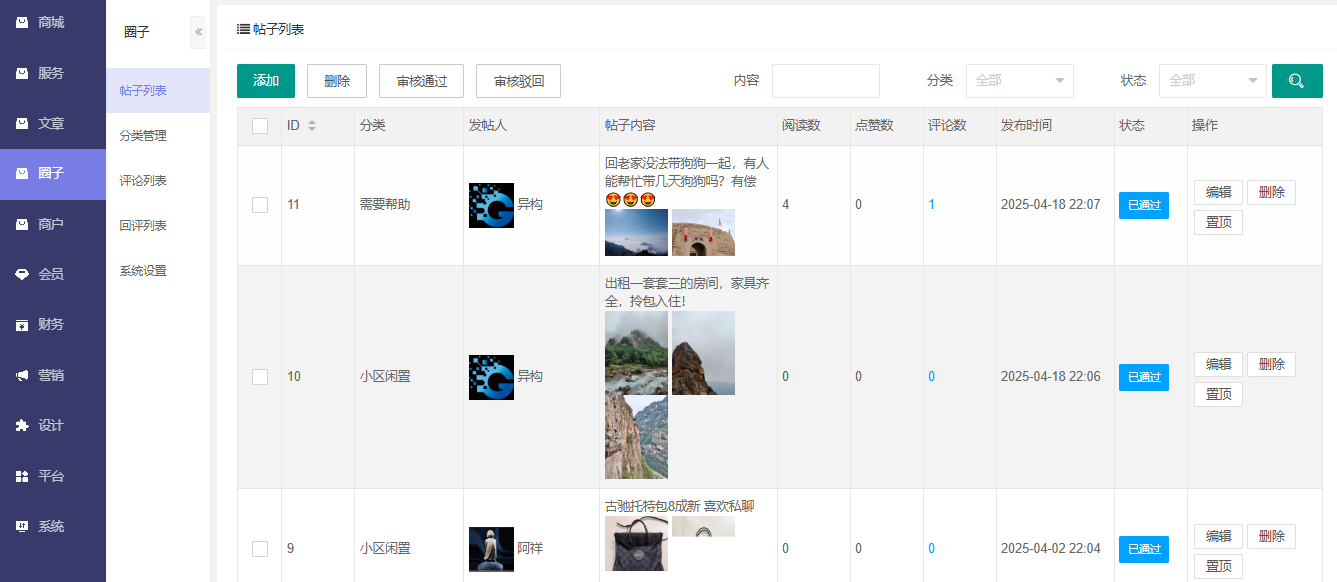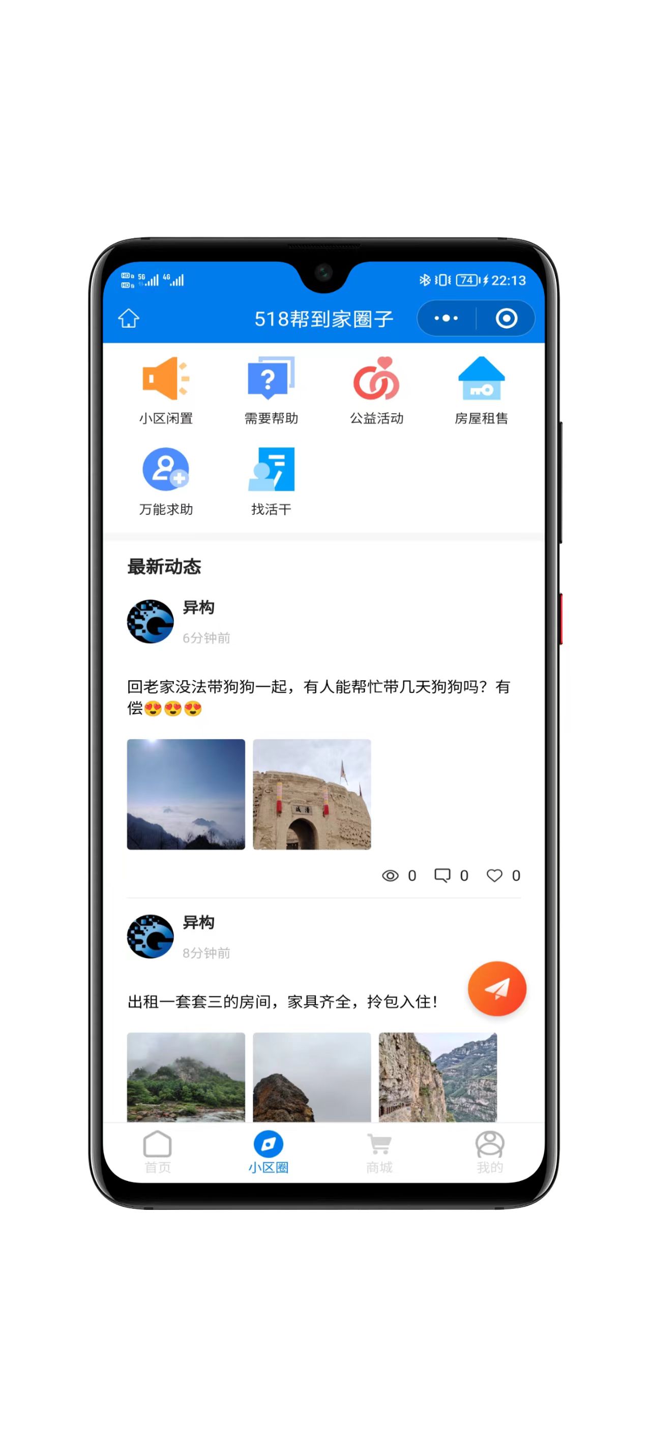 系统包括社区圈子,可发布小区闲置、公益活动、房屋租售、万能求助等等各类动态信息,且类型可扩展,动态信息支持图片、视频类型;