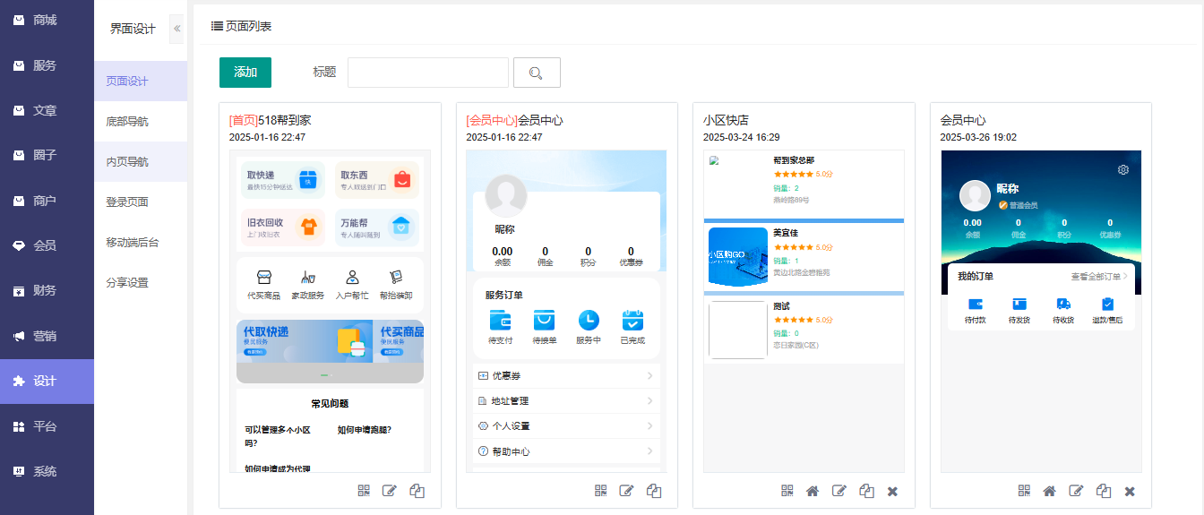 系统支持强大的DIY设计,页面设计、底部导航设计、内页导航设计、登录页面设计等,提供丰富的设计组件使用;