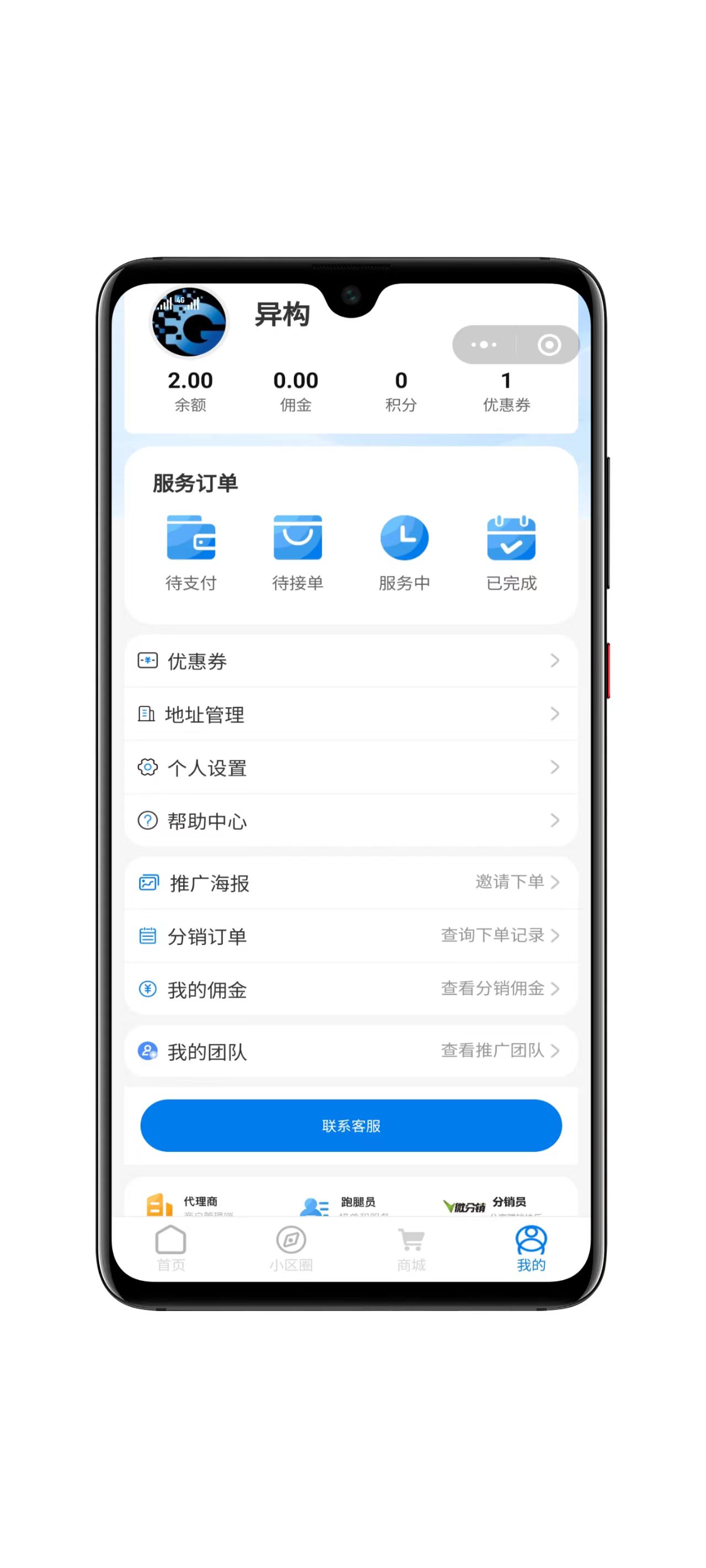 支持申请代理商入驻、跑腿入驻、快递员入驻、分销员、佣金系统等;