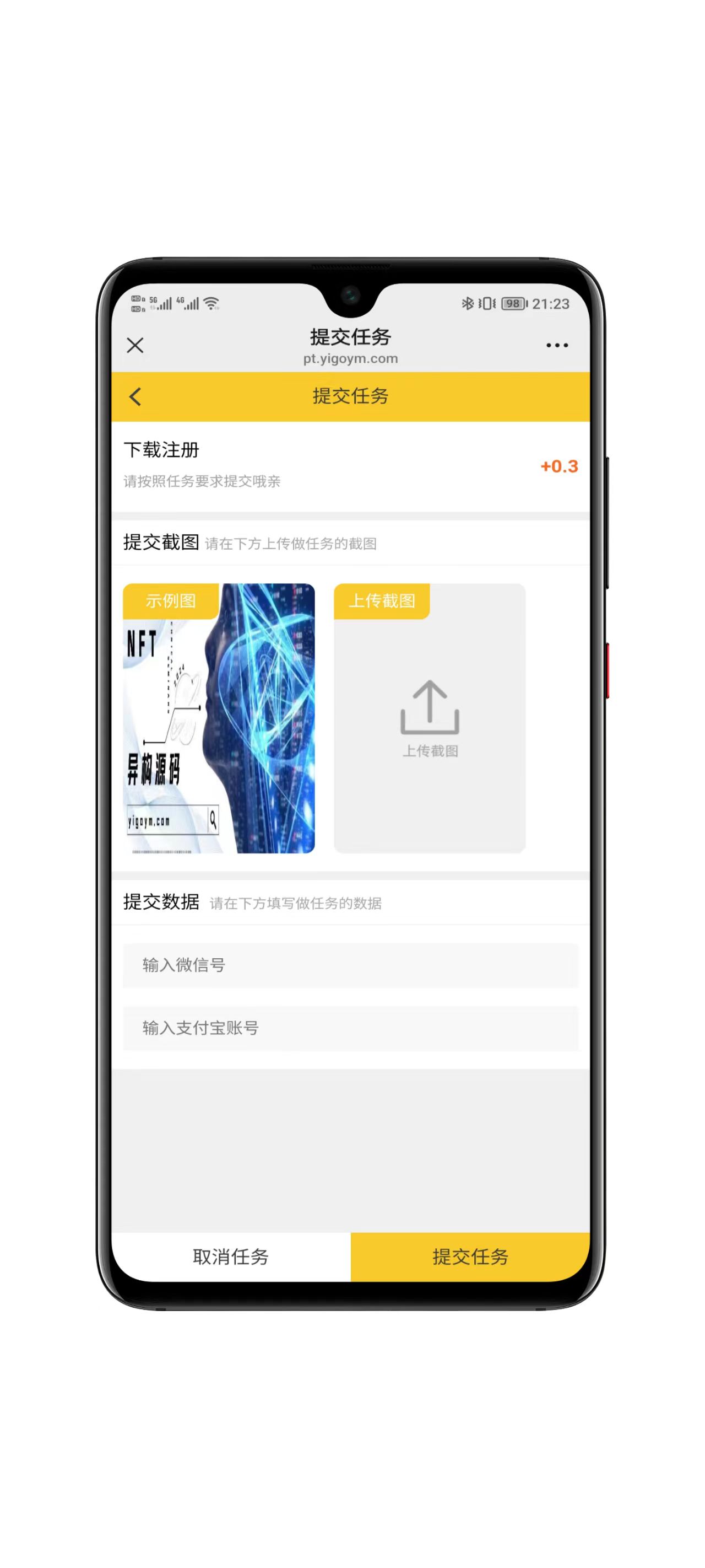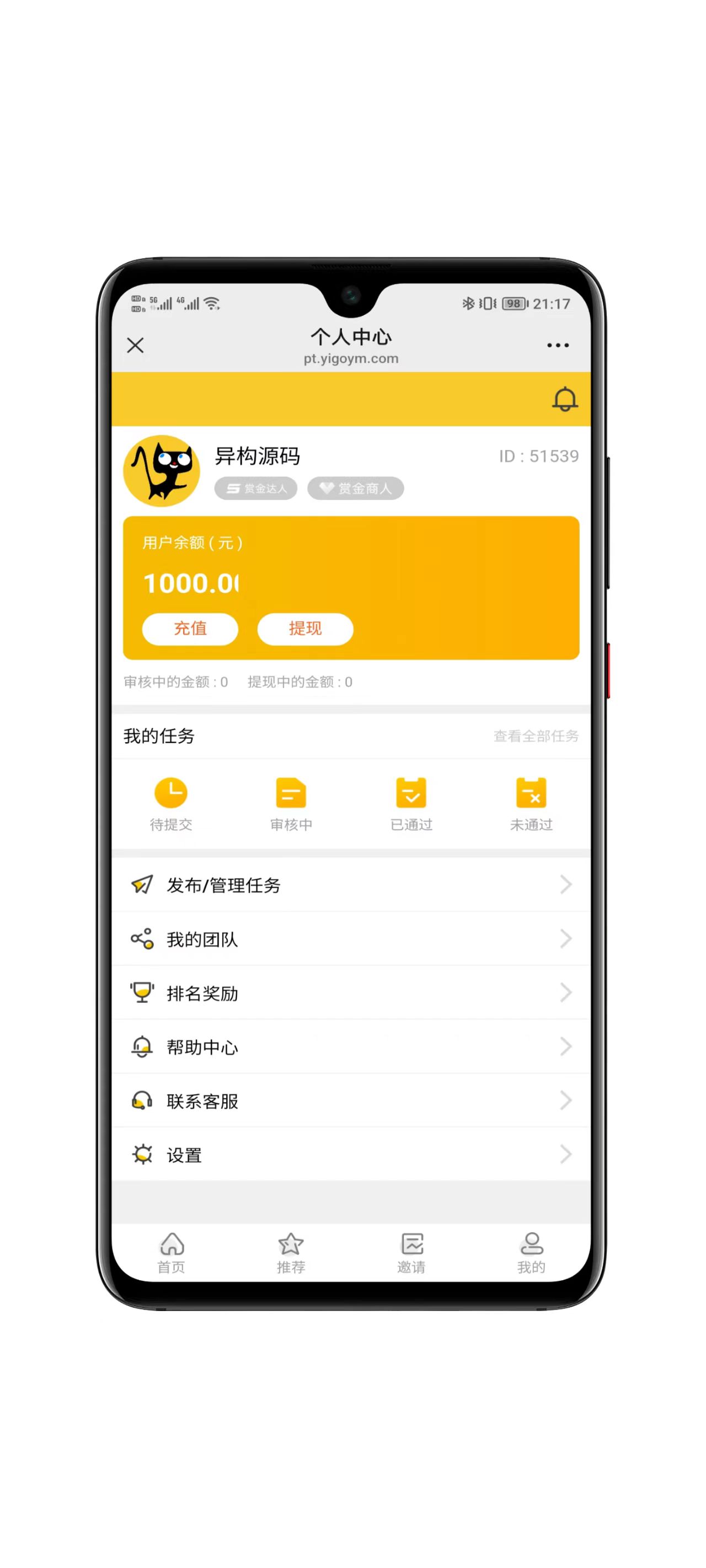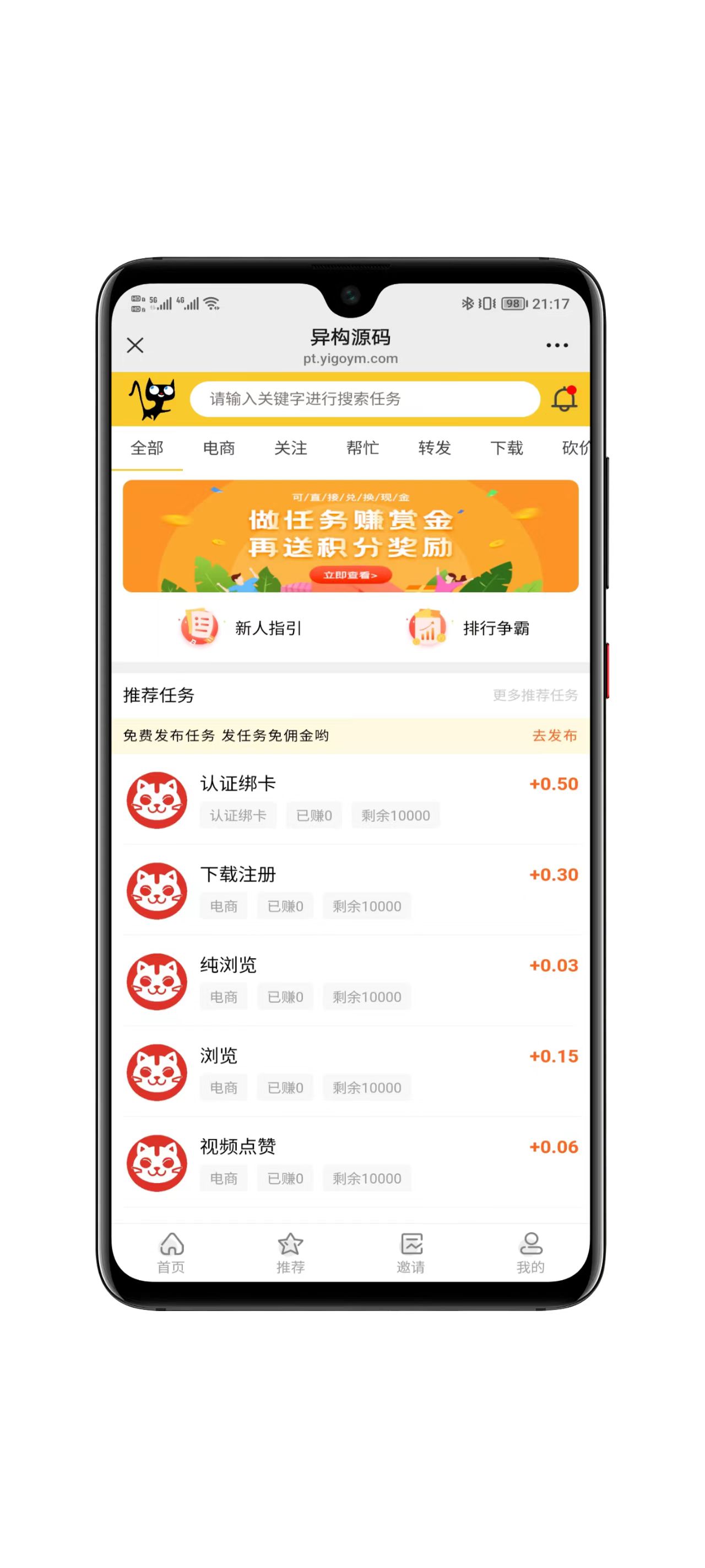 任务悬赏系统H5版本,可以打包封装成APP,短信对接的短信宝,可自定义设置多种类型任务,带邀请推广,前后端源码都是无加密的,后端php,前端是原生html+模版技术!