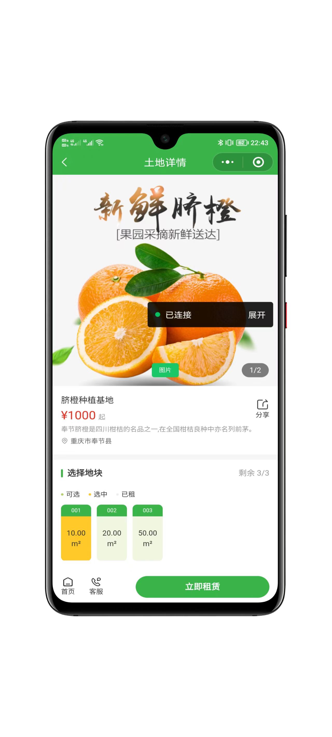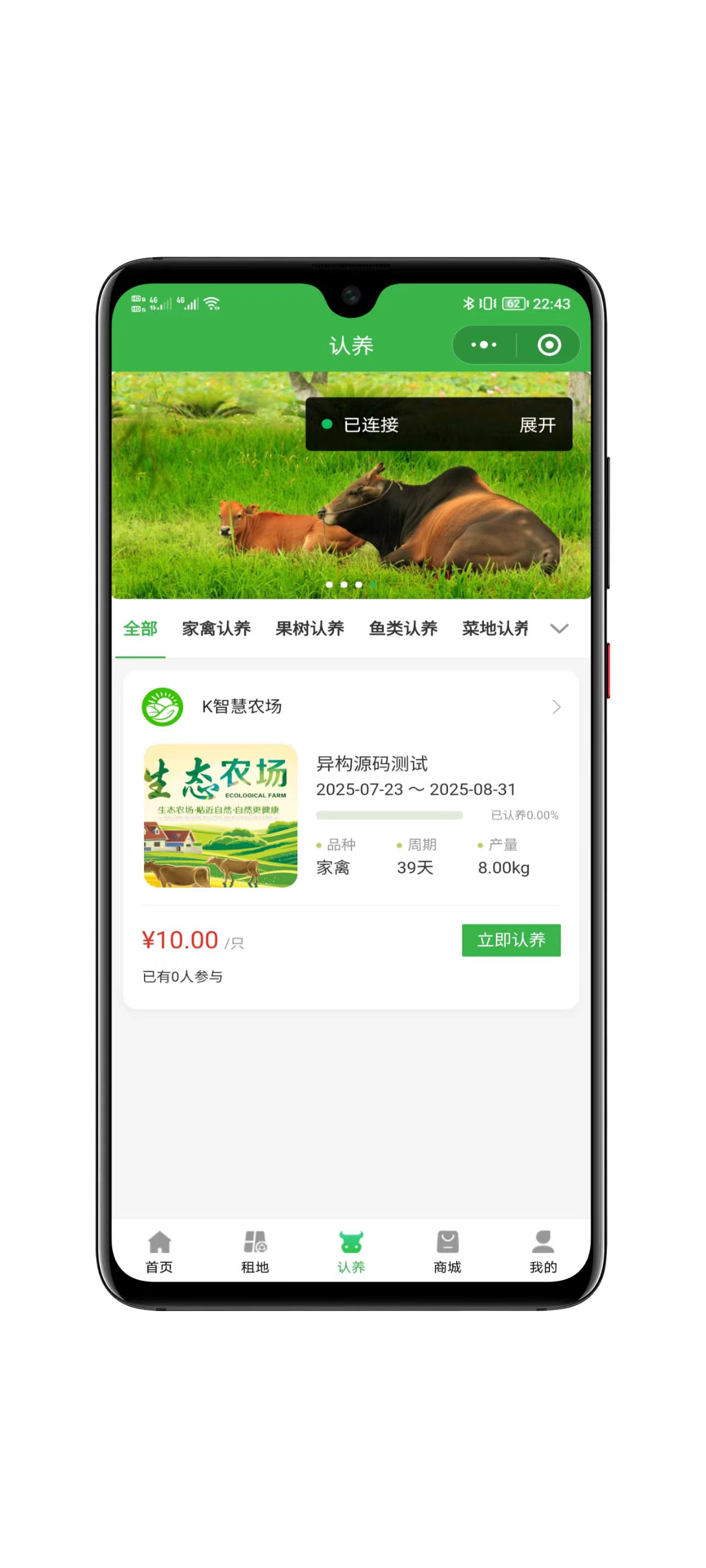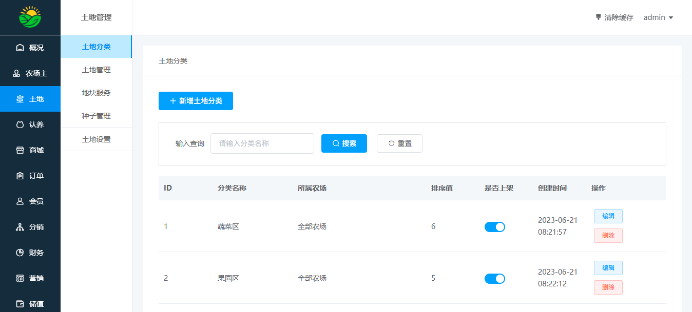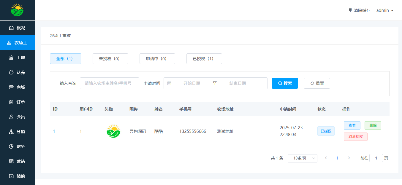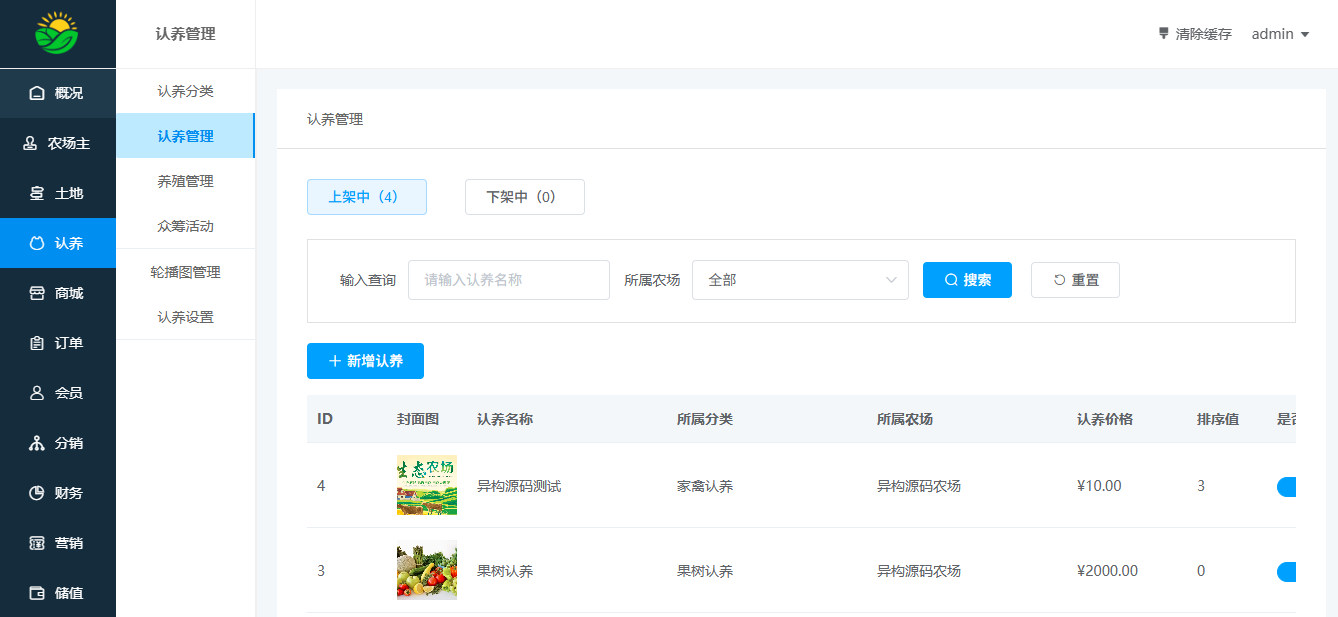 核心功能包括农场主管理、农场主入驻申请、土地管理、土地出租/租赁、农业认养、众筹认养、视频监控等;