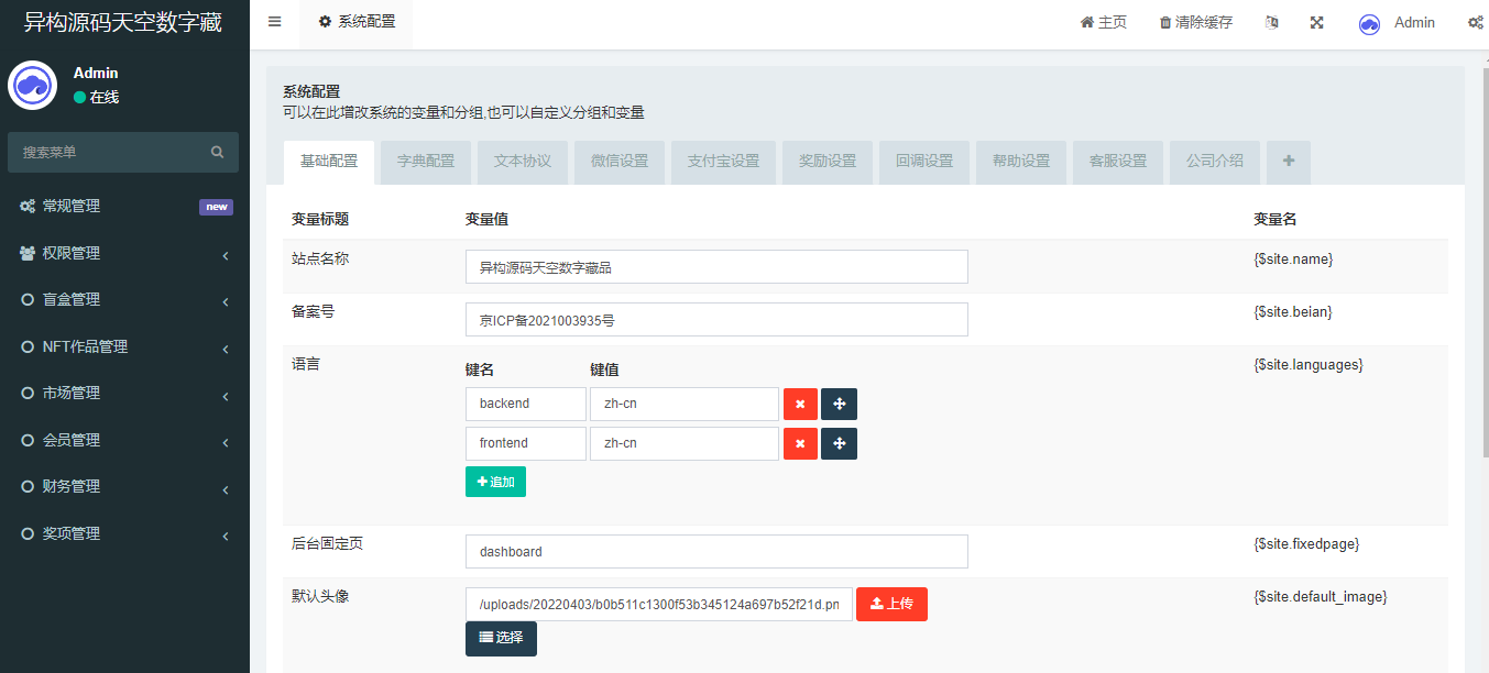 后台功能完善,包括系统管理、权限管理、盲盒管理、NFT作品管理、市场管理、会员管理、财务管理、奖项管理,前端UI兼容性完美,已对接官方支付!