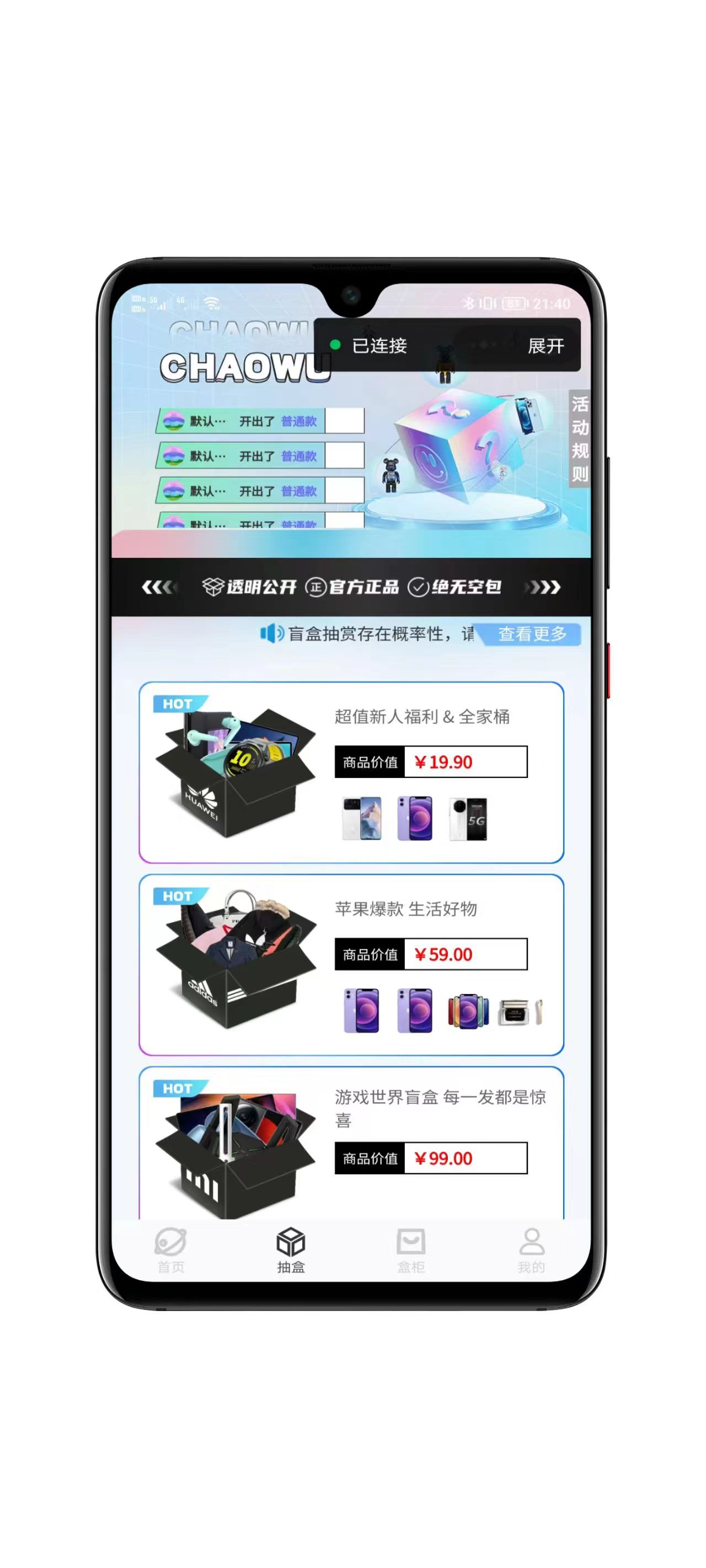 非常不错的运营级盲盒商城系统,后台功能非常完善,支持小程序、H5,后端采用Laravel框架进行开发,前端开发框架使用uniapp+vue!ui设计很好的提升整个盲盒购买乐趣!